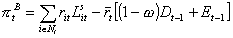 4.1 Firms At any time period t, the supply side of the economy consists of finitely many competitive firms indexed with i = 1, ..., Nt, each one located on an island. The total number of firms (hence, islands) Nt depends on t because of endogenous entry and exit processes to be described below. Let the i-th firm uses capital (Kit) as the only input to produce a homogeneous output (Yit) by means of a linear production technology, Yit = f Kit. Capital productivity (f ) is constant and uniform across firms, and the capital stock never depreciates. The demand for goods in each island is affected by an iid idiosyncratic real shock. Since arbitrage opportunities across islands are imperfect, the individual selling price in the i-th island is the random outcome of a market process around the average market price of output Pt, according to the law Pit = uitPt, with expected value E(uit) = 1 and finite variance. By assumption, firms are fully rationed on the equity market, so that the only external source of finance at their disposal is credit. The balance sheet identity implies that firms can finance their capital stock by recurring either to net worth (Ait) or to bank loans (Lit), Kit = Ait + Lit. Under the assumption that firms and banks sign long-term contractual relationships, at each t debt commitments in real terms for the i-th firm are ritLit, where rit is the real interest rate. If, for the sake of simplicity, the latter is also the real return on net worth, each firm incurs financing costs equal to rit(Lit + Ait) = ritKit. Total variable costs proportional to financing costs, gritKit, with g > 1. Therefore, profit in real terms (p it) is: