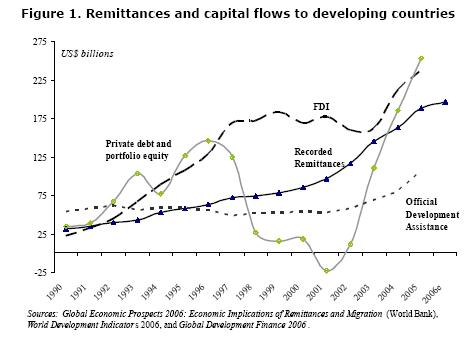 States of America, Germany, France, and Canada. As emigrants are spreading geographically, the number of host countries is widening, which stabilizes the flows, potentially also during the business cycle. A comparison with other financial flows, as FDI, is given in this graph: